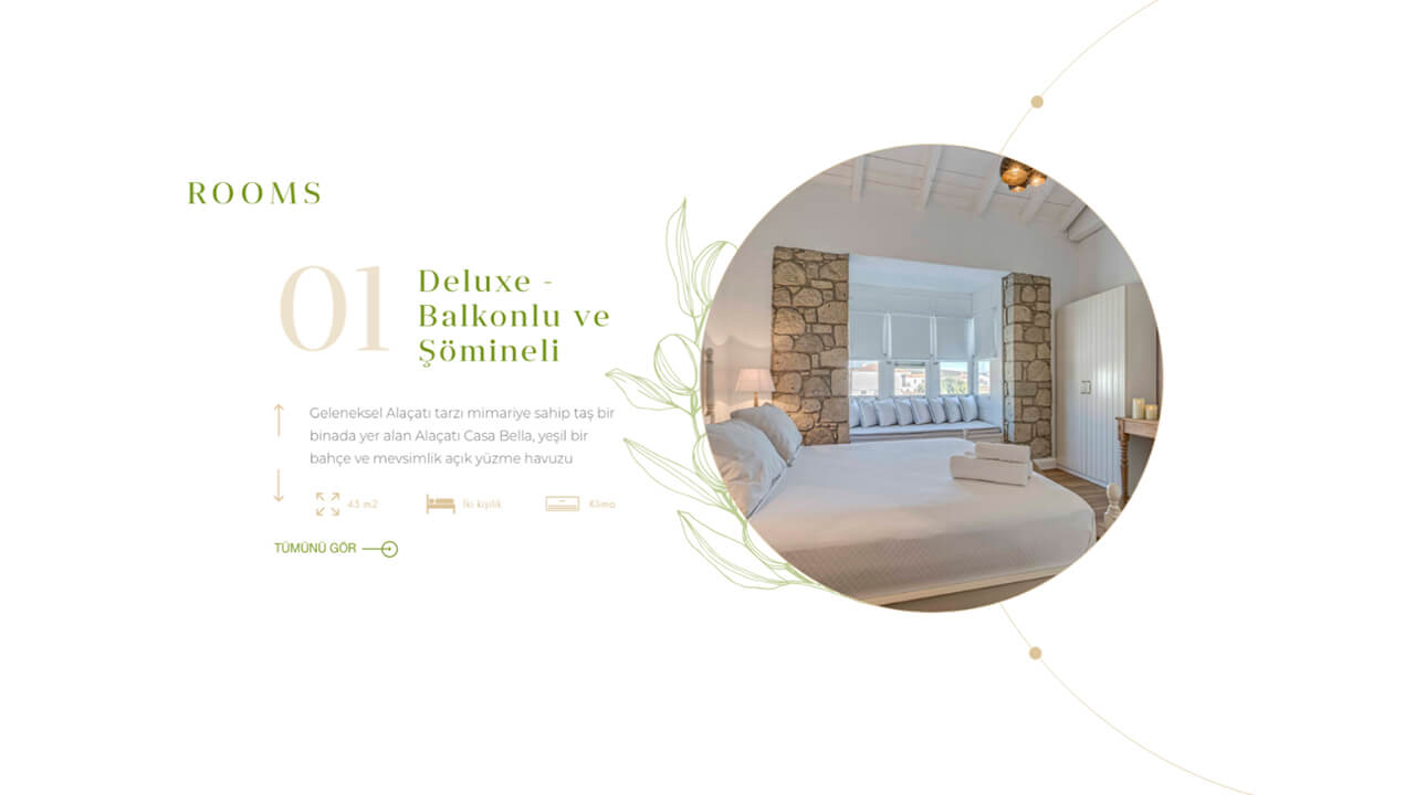 Küçük ve etkileyici otellerin hastasıyız. Bulunduğu konumdan etkilenen, tarihi dokusunu kaybetmeden çağdaşlaştırılmış Alaçatı Casa Bella’nında, bu yönde bir web sitesi ve ekrana yansıması gerektiği düşündük. Web sitesine girdiğinizde sanki otelin kapıları ardına kadar açılmış, sizi muhteşem bir doğa karşılıyormuş gibi hissedeceksiniz. Hislerinizde yanılmadan bir ziyaret edin.